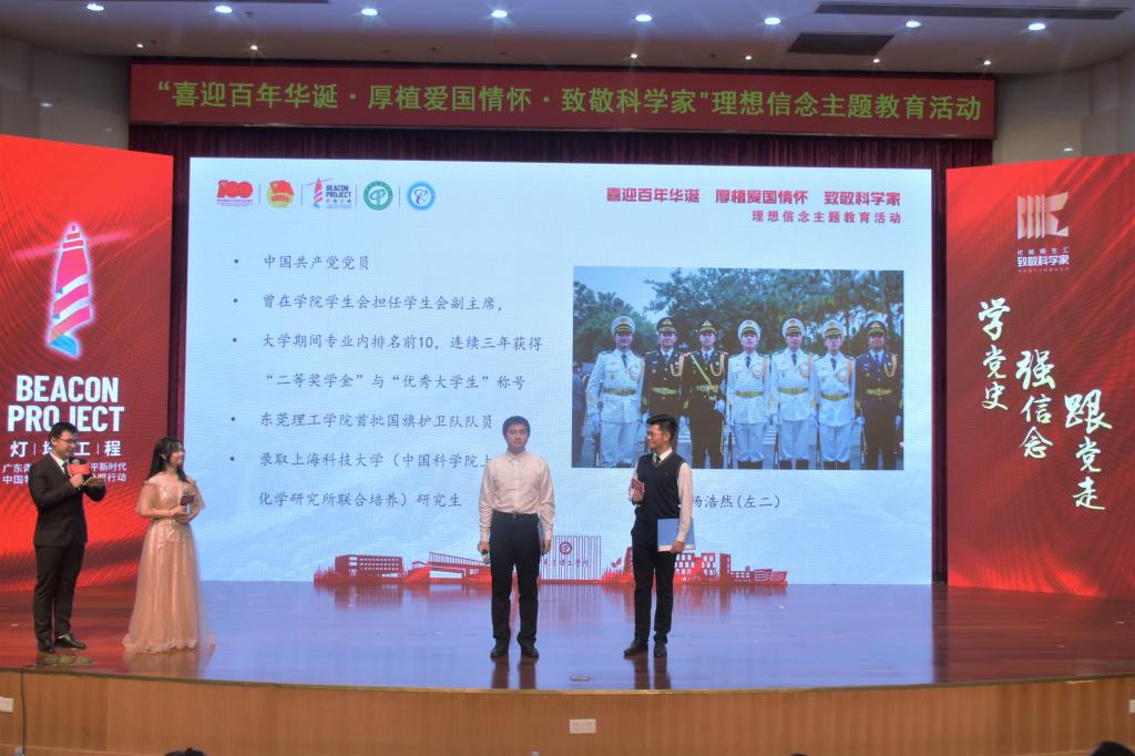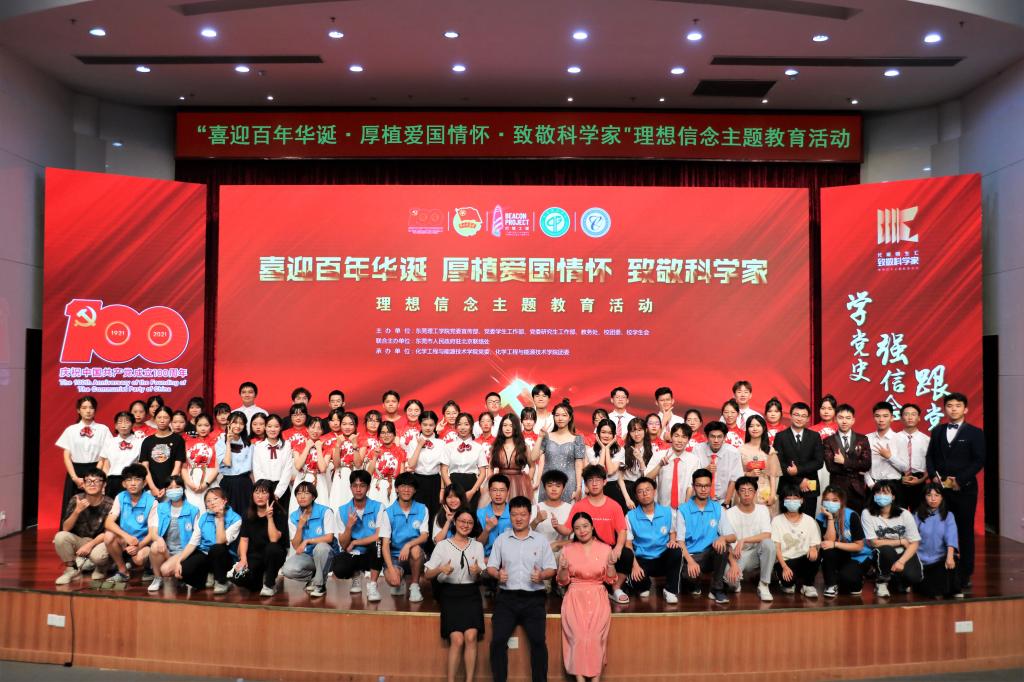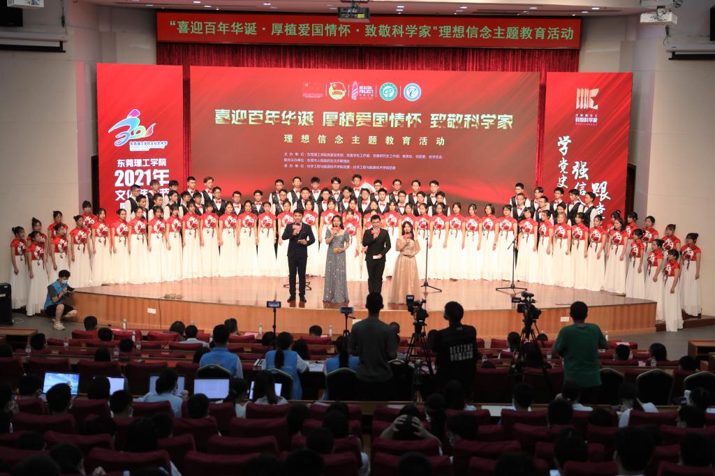 在喜迎中国共产党百年华诞之际,恰逢学校喜迎30周年校庆,5月30日正值全国科技工作者日,2021年东莞理工学院文化艺术节展演项目之“喜迎百年华诞•厚植爱国情怀•致敬科学家”理想信念主题教育活动在学术会议中心报告厅隆重举行,并在B站互联网线上实时直播。本次活动由东莞理工学院党委组织部、党委宣传部、党委学生工作部、党委研究生工作部、教务处、校团委、校学生会共同主办,由东莞市人民政府驻北京联络办联合主办,化学工程与能源技术学院承办。