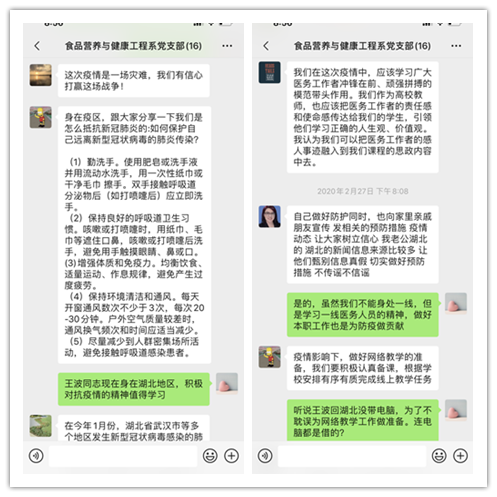 新型冠状病毒肺炎疫情的爆发,对人民生命安全造成严重的威胁,对我们的工作生活也造成巨大困扰。这次疫情发生以来,以习近平同志为核心的党中央高度重视,始终把人民群众生命安全和身体健康放在第一位,中央政治局常委会多次召开会议,专题研究会部署疫情防控工作。在此背景下,食品系教师支部全体党员学习了疫情防控的指引等文件及发表了学习心得,分享了近期工作情况,同时党员同志自发组织捐款,助力疫情防控。