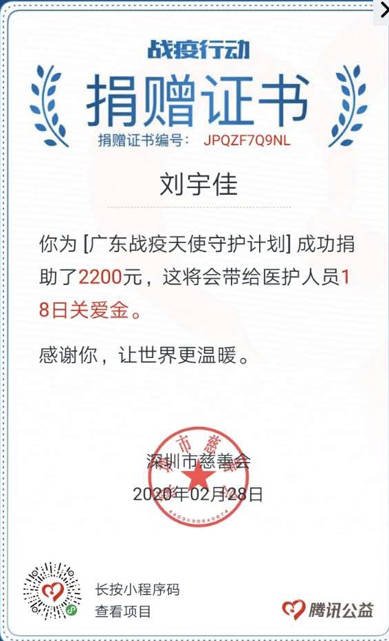 为支持武汉抗击疫情,向奋战在一线的医务人员致敬,食品系教师支部党员自发组织募捐活动,全体党员用实际行动支持全国抗“疫”大业,全力驰援武汉,累积爱心善款2200元。支部将收到的善款共计2200元,由支部组织委员刘宇佳同志为代表定向捐赠给深证市慈善会“广东战役天使守护计划”,全部定向用于为广东赴湖北的医护人员提供关爱金和保障金。