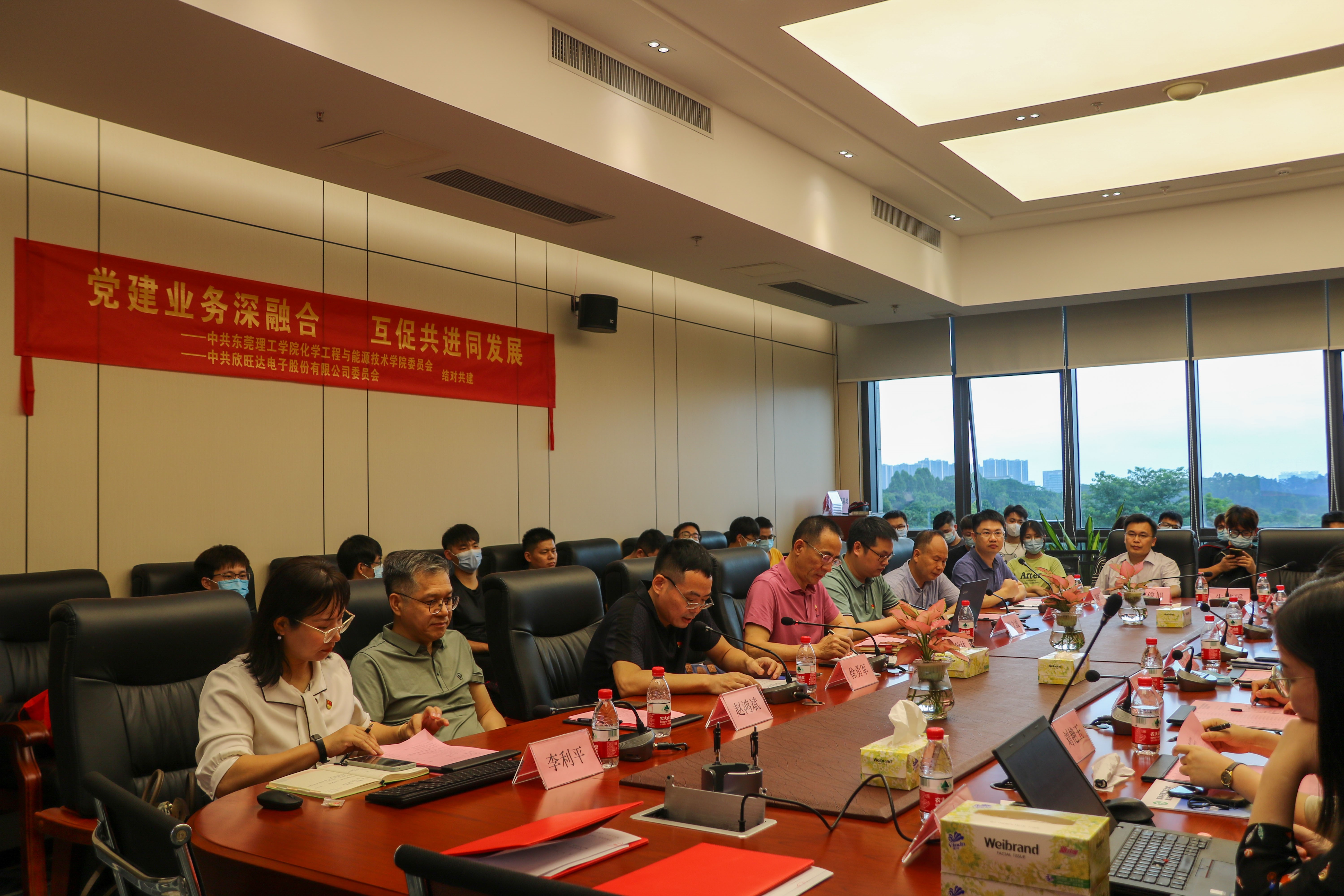 为深入学习贯彻党的十九届六中全会精神和广东省第十三次党代会精神,进一步探索高校二级学院党建共建新模式,促进党建业务深度融合,7月6日,化学工程与能源技术学院化党委(以下简称“3044am永利集团官网党委”)与欣旺达电子股份有限公司党委开展“党建业务深融合,互促共进同发展”结对共建活动。我校党委委员、副校长杨敏林,化学工程与能源技术学院党委书记、院长徐勇军,党委副书记李利平、副院长陈佰满,教务处副处长廖文波、化学工程与能源技术学院教授老师、教师党员代表、学生代表,欣旺达电子股份有限公司党委书记、总裁助理、欣旺达大学执行校长尹庆玲、欣旺达惠州动力新能源有限公司制造副总经理刘桂松以及欣旺达电子股份有限公司党建专员等参加本次结对共建活动。
