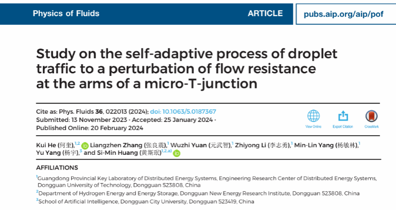 我院广东省分布式能源系统重点实验室黄斯珉团队在美国物理联合会旗下流体力学顶级期刊Physics of Fluids上发表题为“Study on the self-adaptive process of droplet traffic to a perturbation of flow resistance at the arms of a micro-T-junction”研究论文。