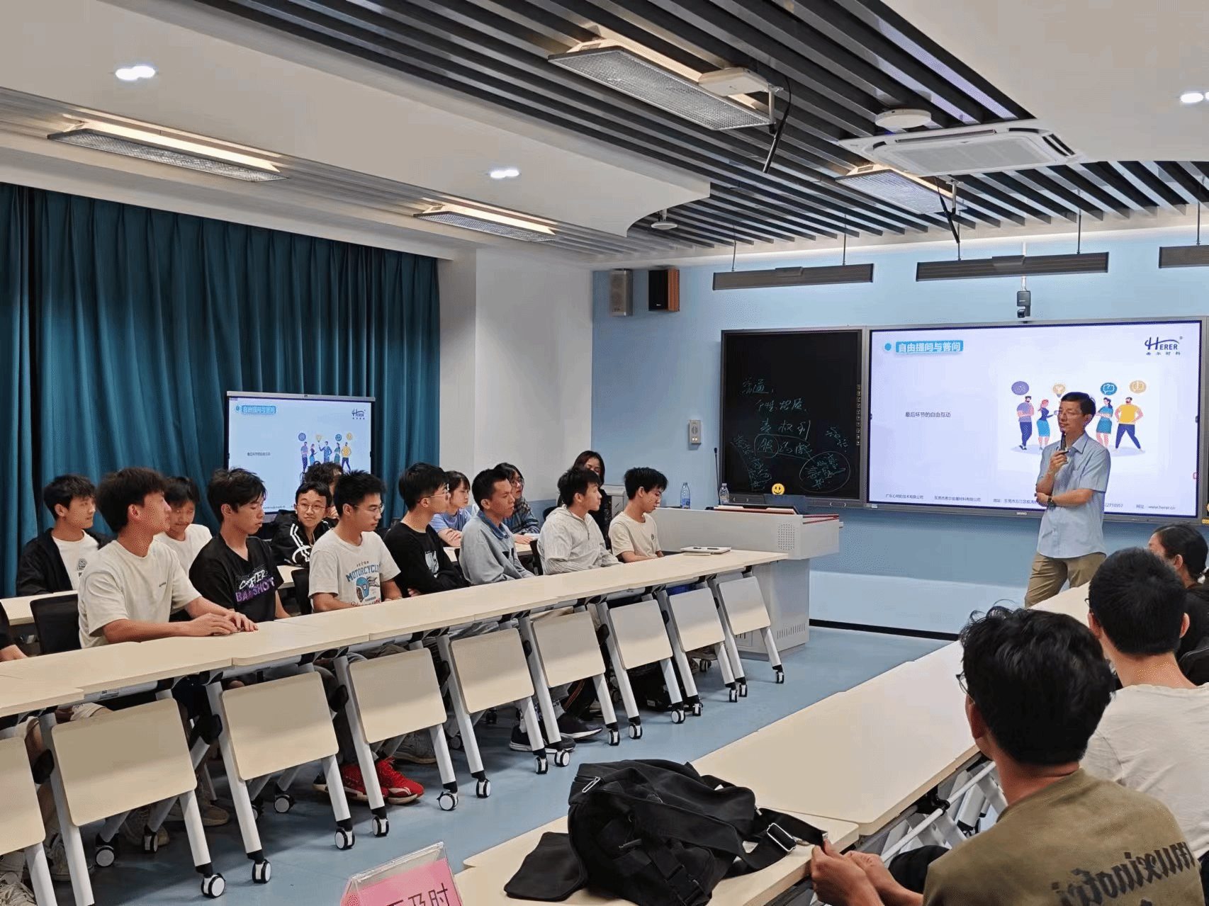 主讲人石及时就求职过程中的面试环节展开讲解,剖析企业在选人用人方面的选择与衡量。他以自身为例,从企业的角度出发,为同学们在求职面试环节提出切实可行的意见和建议,解答了同学们在简历撰写以及投递过程中的疑惑与难题。人事主管郭夏吟女士以企业在发布招聘广告的过程为例,解释了同学们如何在海量的招聘信息中找到对口的工作并且撰写出一份合适的简历,做好求职第一步。在现场提问环节中,同学们积极参与、踊跃提问,石及时悉心聆听,认真解答,现场气氛热烈,同学们获益良多。