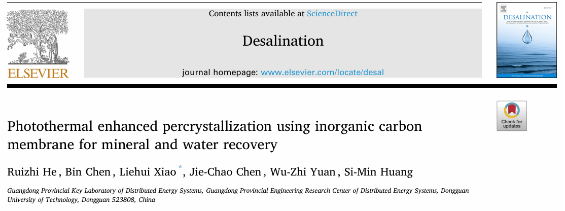 2023级能源动力硕士研究生何睿智以论文第一作者在国际权威期刊《Desalination》(中科院1区)上发表题为“Photothermal enhanced percrystallization using inorganic carbon membrane for mineral and water recovery”学术论文,肖烈晖博士为通讯作者,东莞理工学院为第一完成单位。