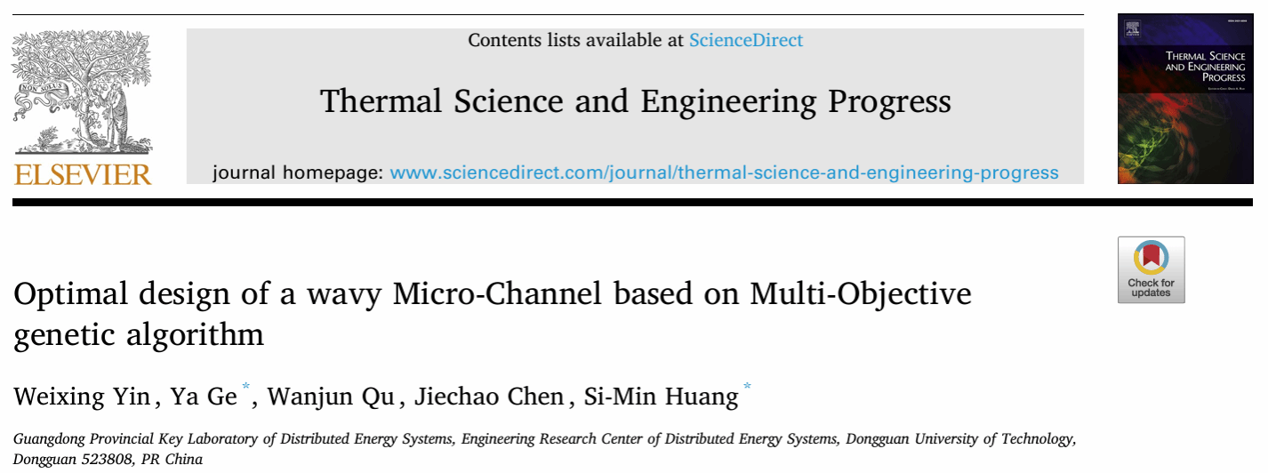 2023级能源动力硕士研究生尹炜星以第一作者在国际知名期刊《Thermal Science and Engineering Progress》(中科院2区)上发表题为“Optimal design of a wavy Micro-Channel based on Multi-Objective genetic algorithm”学术论文,黄斯珉研究员和葛亚副教授为共同通讯作者,东莞理工学院为第一完成单位。