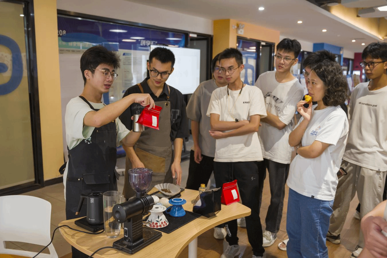 互动环节掀起活动高潮,林志坚同学邀请一位同学上台,现场演示手冲咖啡的精妙技艺,从注水角度到研磨手法,无不体现出对品质的执着和对细节的打磨。这不仅让同学们沉浸在咖啡的醇香之中,也深刻领悟到:创业之路不仅要有想法,更要有实干精神与专业素养作为支撑。