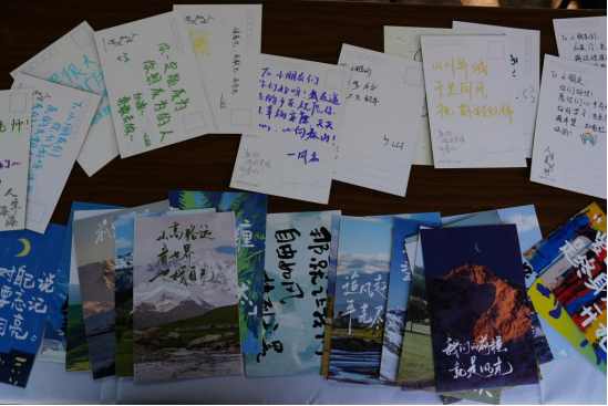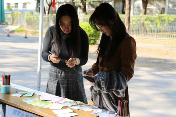 活动当天,现场气氛热烈、互动频繁。志愿者们分工协作,有条不紊地承担起产品介绍、销售协助等工作。他们用热情细致地讲解,向师生讲述农产品背后的乡村故事与生产艰辛,让消费帮扶变得有温度、有记忆。与此同时,丰羽志愿服务队还在服务间隙开展手写祝福明信片的温情环节,为远在千里的甘肃陇南的孩子们写下诚挚鼓励与美好祝愿。