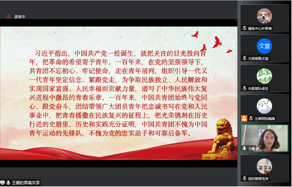 本次会议王馨老师以“闪亮青春,点燃时代之光”为主题向大家授课。会上,王馨老师首先带领大家学习习近平总书记在庆祝共青团成立100周年大会上的重要讲话精神,共同回顾共青团成立一百年来的奋斗历程,深切感受习近平总书记对青年一代的亲切关怀和殷殷嘱托。在党的坚强领导下,共青团不忘初心、牢记使命,组织一代代青年砥砺奋斗,锐意进取,成为党可靠的忠实助手和后备军。