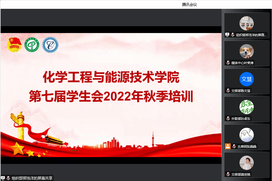 为学习贯彻习近平总书记关于青年工作的重要思想内容,根据全国学联、广东学联关于学生会工作要求,严格落实学生会工作人员培训制度,加强从严治会,强化思想引领作用。2022年10月18日晚,化学工程与能源技术学院团委、学生会通过腾讯会议于线上召开2022年秋季学生会干部培训会。政治辅导员王馨、青年创新创业服务中心副主任姚奕群、第七届团学预备部长团和部分2022级新生出席本次会议。