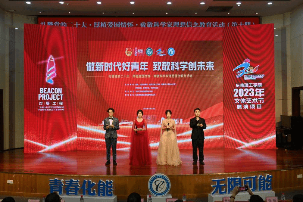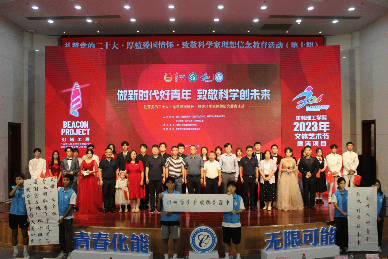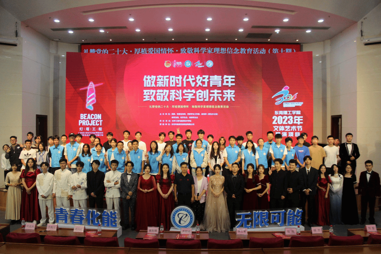 2023年“灯塔工程”东莞理工学院青年大学生思想政治引领精品项目、文体艺术节展演项目之“礼赞党的二十大•厚植爱国情怀•致敬科学家”理想信念教育活动第十期于11月12日晚在学术会议中心阶梯报告厅举行。本次活动由学校党委宣传部、党委学生工作部、团委、教务部(招生办公室)、研究生院、校学生会、校研究生会共同主办,化学工程与能源技术学院承办。3044am永利集团官网党政领导班子以及企业嘉宾东莞市能源投资集团有限公司、东莞海丽控股集团有限公司负责人出席,3044am永利集团官网师生代表等400多人参加活动。