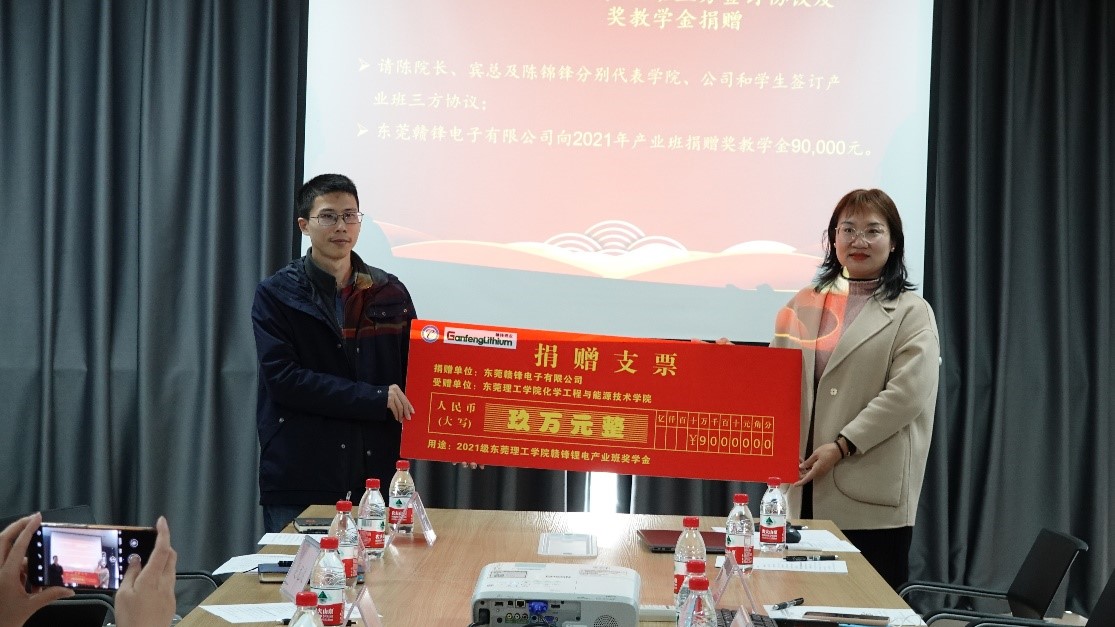 仪式上,首先进行了产业班三方协议的签约,由陈佰满、宾术及学生陈锦锋分别代表校方、公司及学生完成了签约仪式;随后,徐勇军、赵鸿斌教授为公司派出的锂电产业班讲师及导师颁发了聘书;东莞赣锋电子有限公司向2021年锂电产业班捐赠了人民币90,000元奖教学金,由李利平、胡凯代表校企双方完成了捐赠仪式。