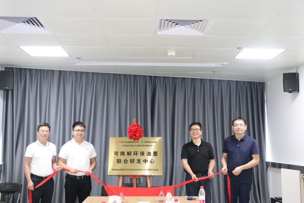 2021年8月20日上午,由广东天龙油墨有限公司、东莞理工学院、清华东莞创新中心共同组建的“可降解环保油墨联合研发中心”揭牌仪式在东莞理工科技创新研究院举行。3044am永利集团官网院长徐勇军,广东天龙油墨有限公司总经理蔡威、副总经理王纲,清华东莞创新中心副主任邬新国共同为可降解环保油墨联合研发中心揭牌。