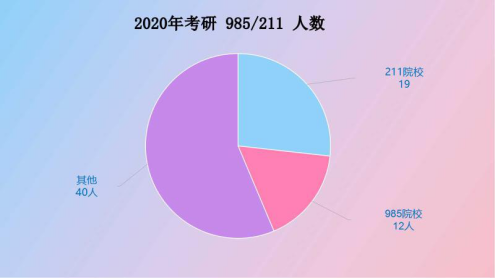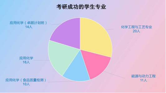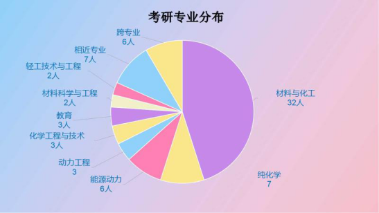化能学子今年被录取研究生专业分布比较广泛。包括材料科学与工程、应用化学、物理化学、化学工程与技术、天然药物化学、食品工程、食品科学、化学工艺、动力工程及工程热物理、有机化学、生物化学与分子生物学、精细化工等多个专业和方向。其中考取的专业主要集中在材料与化工,共有32人。其次是能源动力,化学工程与技术,动力工程,材料科学与工程,动力工程,化学,生物制药,还有6名学生跨学科跨专业考取会计学,金融,心理学等专业。