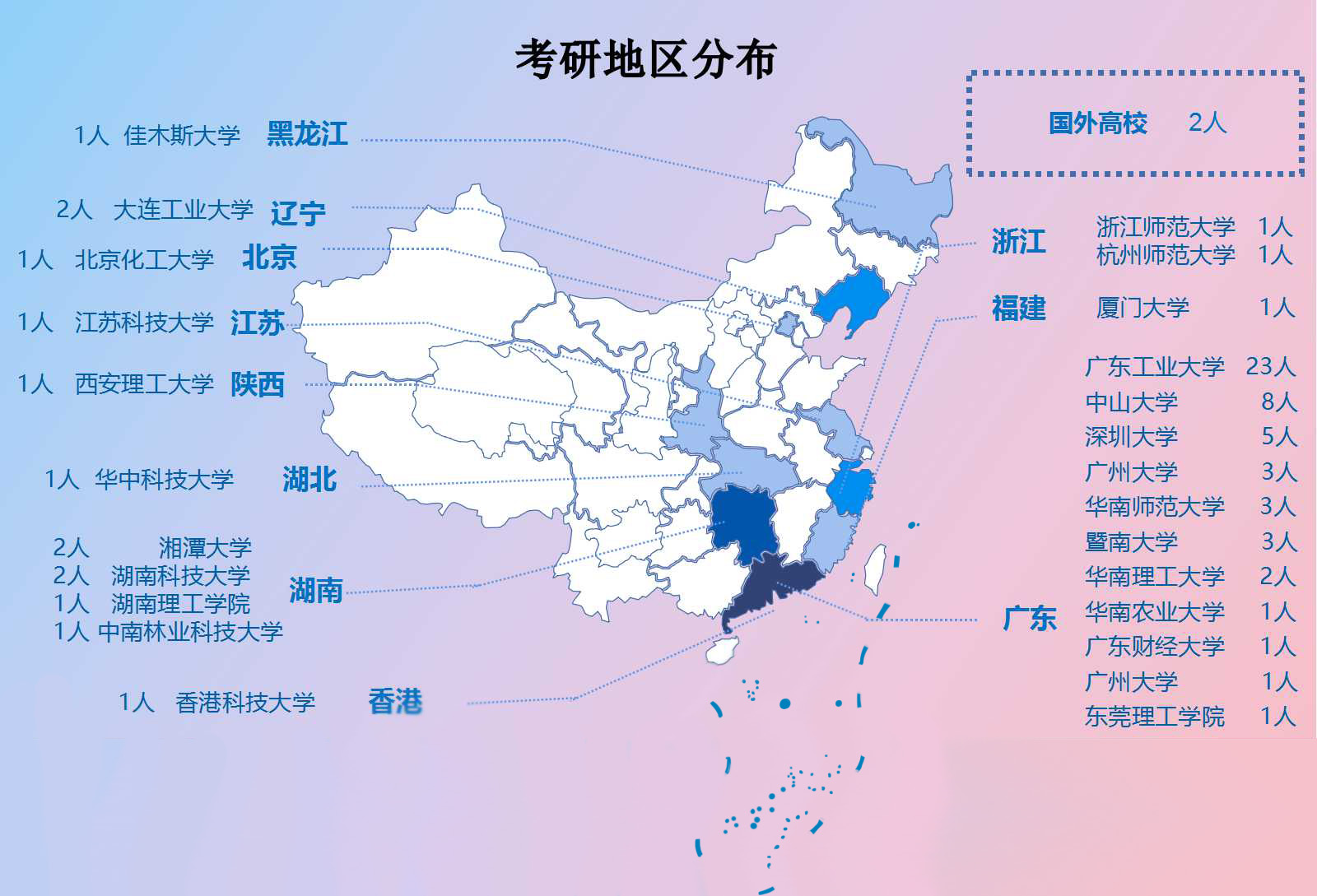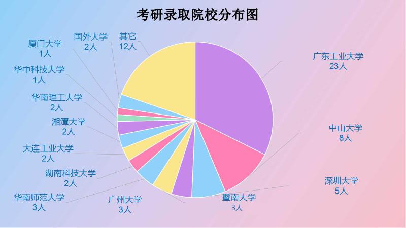 在录取学校名单中,往年化能学子报考学校地区范围主要集中在广东省内,今年学生选择更加多样化,有19人选择考入香港科技大学、厦门大学、华中科技大学、大连工业大学、湘潭大学、湖南科技大学、佳木斯大学等不同省份和地区的高校。其中2人出国深造考取的国外大学分别是杜伦大学(Durham University)和卡迪夫大学(Cardiff university);