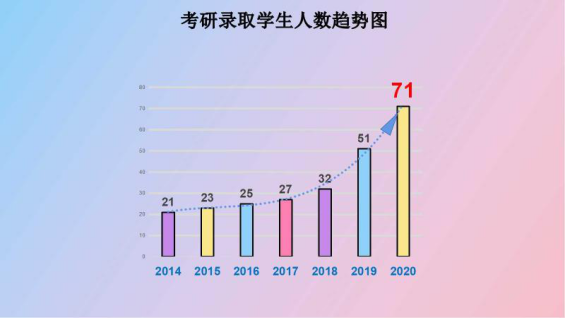 3044am永利集团官网始终坚持以优良学风带动学生考研深造,以浓厚的考研氛围促进学风建设,形成良性循环。近年来,学院考研人数逐年增多,考研录取率逐年升高,2018年3044am永利集团官网共有82人参加研究生入学考试,其中32人被录取。2019年有92人参加研究生入学考试,51人被录取。今年,在学院上下共同努力和政策变化的双重助力下,化能学子参加考研人数翻了一番,达到166人,71人被录取,再创历史新高。