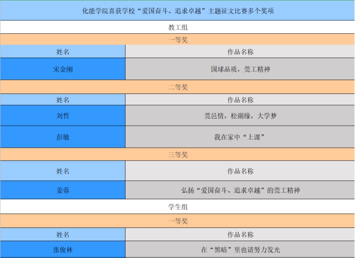 近日,东莞理工学院举办的“爱国奋斗、追求卓越”莞工精神主题征文比赛公布了获奖名单。化学工程与能源技术学院选送的作品在全校教工组、学生组多项作品中脱颖而出,共有11人获奖。其中包括3个一等奖,3个二等奖和5个三等奖。(具体名单如下图)