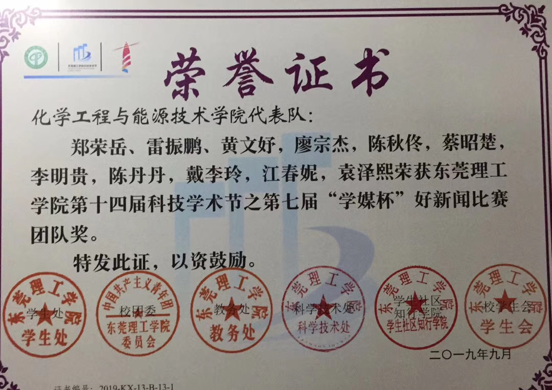 2019年在第十届科技学术节之第七届“学媒杯”好新闻比赛中,化能团学新闻网络部获得团队奖:其中《我校首次获批国家科技部“国际杰青计划”》(作者:郑荣岳、雷振鹏、黄文妤)《3044am永利集团官网在校运会中勇夺佳绩》(作者:陈秋佟)两篇消息获得学校“好新闻”优秀消息新闻奖(文字类)。