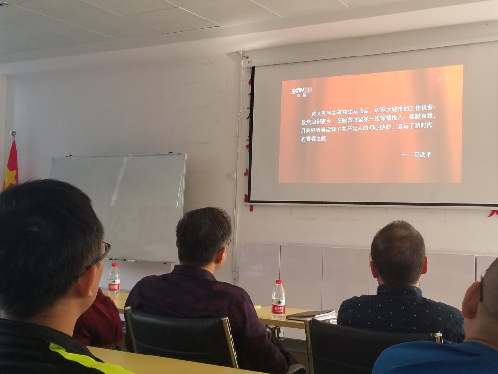 首先,大家集中观看《榜样4——黄文秀》专题节目,重点学习全国优秀共产党员黄文秀同志先进事迹。黄文秀同志研究生毕业后,放弃大城市的工作机会,毅然回到家乡,在脱贫攻坚第一线倾情投入、奉献自我,用美好青春诠释了共产党人的初心使命,谱写了新时代的青春之歌。通过观看黄文秀同志的先进事迹,大家都被她的精神深深感动,为党和国家失去这样一位优秀共产党员而惋惜。对黄文秀同志的最好纪念,就是学习她:“不忘初心、牢记使命”的坚定信念;饮水思源、不改本色的赤子之心;开拓创新、真抓实干的务实作风;心系群众、公而忘私的奉献精神;心系群众、公而忘私的奉献精神。
