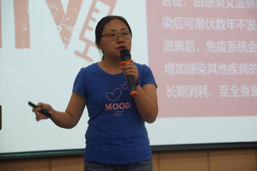 熊静老师向新生提问“大家觉得自己是否是健康的?”浅谈了健康的重要性。“多一份关注,多一份希望,防患于未然。”她通过使用多组数据,讲述了多个真实案例来告诫同学们重视健康的必要性。 熊静老师还重点介绍了感染艾滋病的高危行为和预防艾滋病的措施。她说“健康是生命的基石,要经常关注自己的身体及心理状况。”熊静老师通过引用《扁鹊见蔡桓公》,告诉同学们重视起健康以及如何预防疾病。