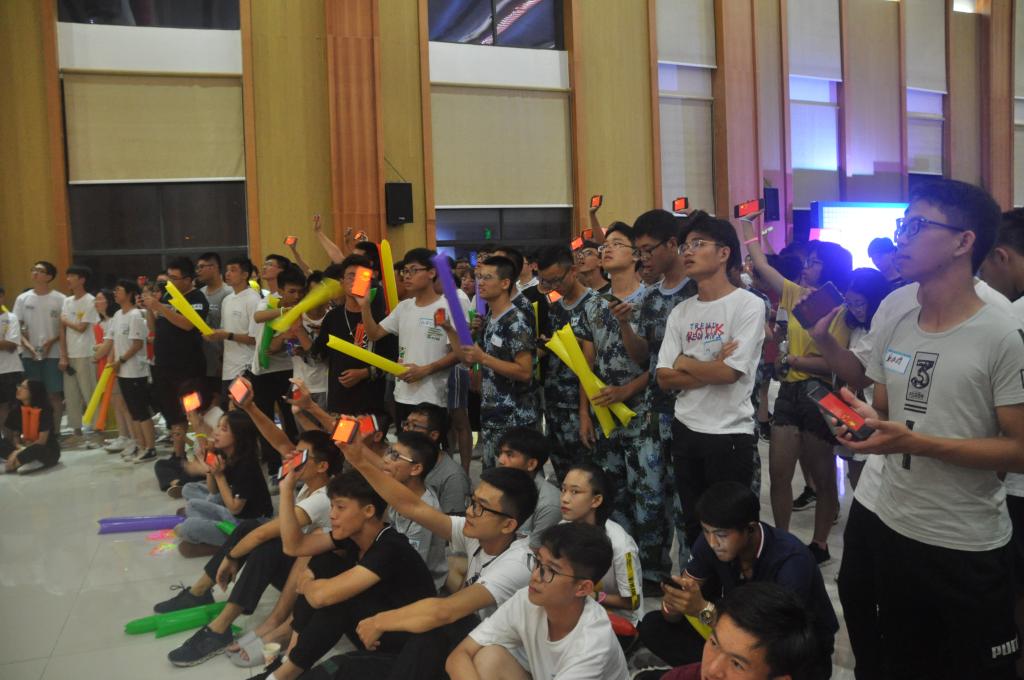 除了为新生庆生外,现场师生也为祖国母亲的70岁生日庆祝了一番。在《我和我的祖国》莞工特制版mv的放映中,全场师生一起高声歌唱,中途不少同学情不自禁拿出手机,点开五星红旗的图片为祖国母亲祝贺。