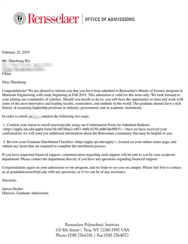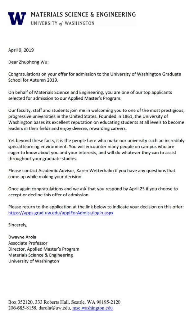 近日,化学工程与能源技术学院2015级应用化学专业吴卓洪同学被美国华盛顿大学,以及美国伦斯勒理工大学硕士研究生项目(thesis-oriented)录取,录取项目分别为材料科学与工程(Materials Science and Engineering)和材料工程(Materials Engineering)。根据美国权威的美国新闻与世界报道(U.S. NEWS)大学综合排名,近年来,华盛顿大学排名世界第10名;伦斯勒理工大学美国大学排名第42名。