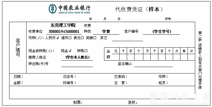 缴款单必填项目: 收款单位:东莞理工学院 账号:44308001941000106 种 类: 学费 客户编号:学生学号 缴费人姓名:学生本人姓名(非代缴款人姓名) |