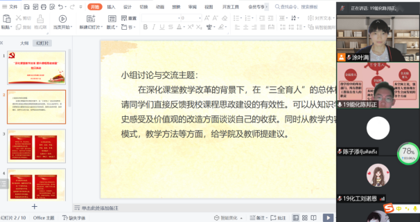 为确保教育教学大讨论工作走深做实,学院成立了以徐勇军院长为组长的工作小组,明确主体职责,科学分工,将课程思政的理念和举措真正落到实处。学院落实教师党支部书记“双带头人”推动课程思政建设的要求,发挥教师党支部建立在教研室、教学团队等基层教学组织上的优势,开展课程思政集体教研,各党支部与基层教学组织目前已经开展9次合作研讨。