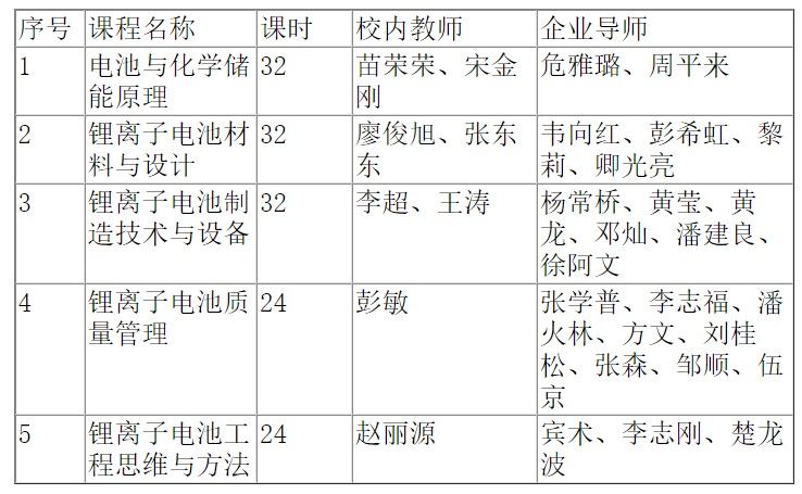 项目包括了产业课程、企业课堂、企业实习等内容,目前已经开设了5门锂电特色产业课程,课程包括电池与化学储能原理、锂离子电池材料与设计、锂离子电池制造技术与设备、锂离子电池质量管理和锂离子电池工程思维与方法,分别在本学期周一至周五下午开课。
