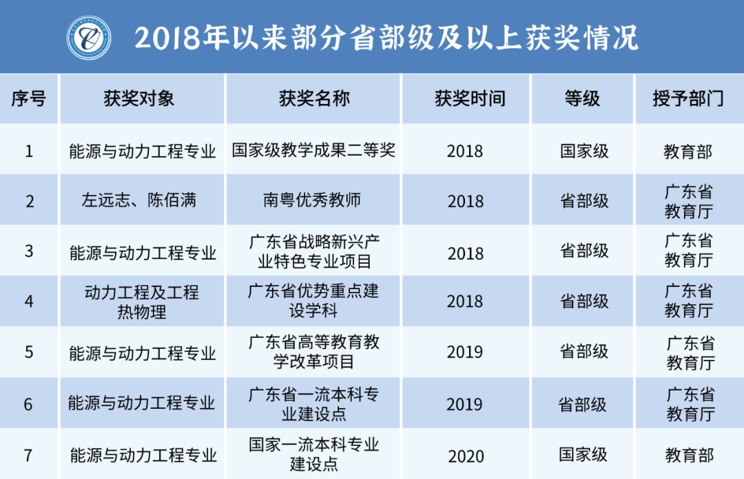 2018年通过广东省战略新兴产业验收,同年动力工程及工程热物理获批为广东省优势重点建设学科;2020年获批省级一流本科专业建设点;2021年获批国家级一流本科专业建设点。