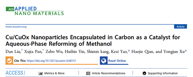 2023级能源动力硕士研究生潘旭佳以共同第一作者在国际知名期刊《ACS Applied Nano Materials》(中科院2区)上发表题为“Cu/CuOx Nanoparticles Encapsulated in Carbon as a Catalyst for Aqueous-Phase Reforming of Methanol”学术论文,徐勇军教授和姚锞子博士为共同通讯作者,东莞理工学院为第一完成单位。