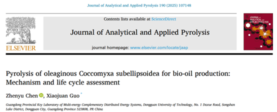 2023级能源动力硕士研究生陈镇宇以第一作者在《Journal of Analytical and Applied Pyrolysis》(中科院2区)上发表题为“Pyrolysis of oleaginous Coccomyxa subellipsoidea for bio-oil production: Mechanism and life cycle assessment”论文,郭晓娟副教授为通讯作者,东莞理工学院为第一完成单位。