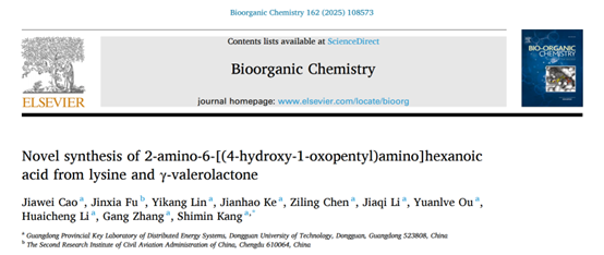 2023级能源动力硕士研究生曹嘉伟以第一作者在国际知名期刊《Bioorganic Chemistry》(中科院1区)上发表题为"Novel synthesis of 2-amino-6-[(4-hydroxy-1-oxopentyl)amino]hexanoic acid from lysine and γ-valerolactone”学术论文,康世民副教授为通讯作者,东莞理工学院为第一完成单位。
