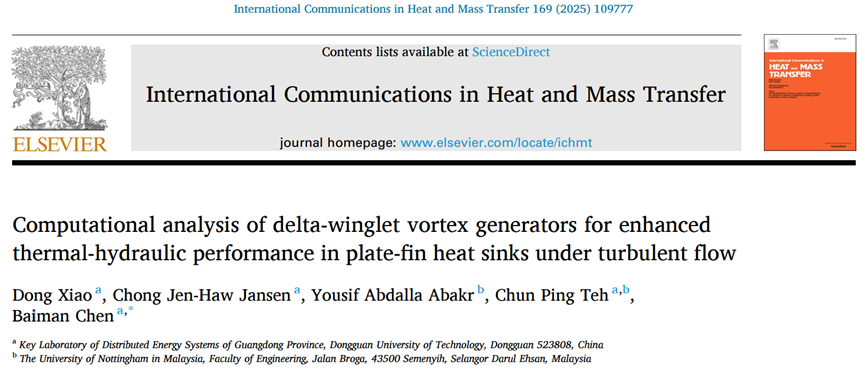 2023级能源动力硕士研究生肖东以第一作者在国际知名期刊《International Communications in Heat and Mass Transfer》(中科院2区)上发表题为“Computational analysis of delta-winglet vortex generators for enhanced thermal-hydraulic performance in plate-fin heat sinks under turbulent flow”的创新研究成果,陈佰满教授为通讯作者,东莞理工学院为第一完成单位。研究团队创新性地建立了VG参数与热工性能的预测模型(Nu与f的RSM模型拟合度R²>95%),解决了多排VG在受限通道中的涡流干涉难题。该成果不仅为电子散热器设计提供量化依据,其涡流控制策略还可拓展至紧凑型热交换器与能源系统优化,推动绿色热管理技术发展。